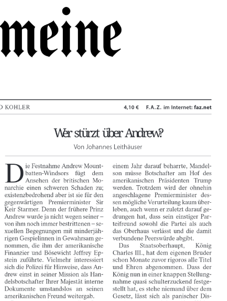 Am 20. Februar 2026 eröffnete der UK-Korrespondent der FAZ, Johannes Leithäuser, einen Kommentar zur Festnahme von Andrew Mountbatten-Windsor mit den folgenden Sätzen: "Die Festnahme Andrew Mountbatten-Windsors fügt dem Ansehen der britischen Monarchie einen schweren Schaden zu; existenzbedrohend aber ist sie für den gegenwärtigen Premierminister Sir Keir Starmer. Denn der frühere Prinz Andrew wurde ja nicht wegen seiner – von ihm noch immer bestrittenen – sexuellen Begegnungen mit minderjährigen Gespielinnen in Gewahrsam genommen, die ihm der amerikanische Finanzier und Bösewicht Jeffrey Epstein zuführte."
