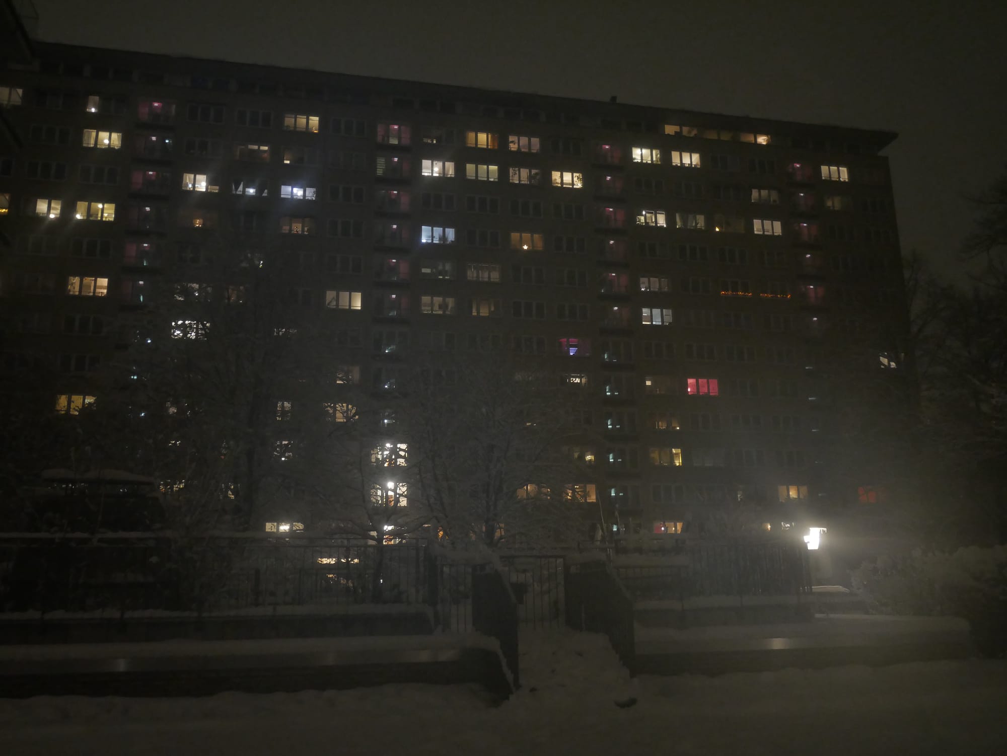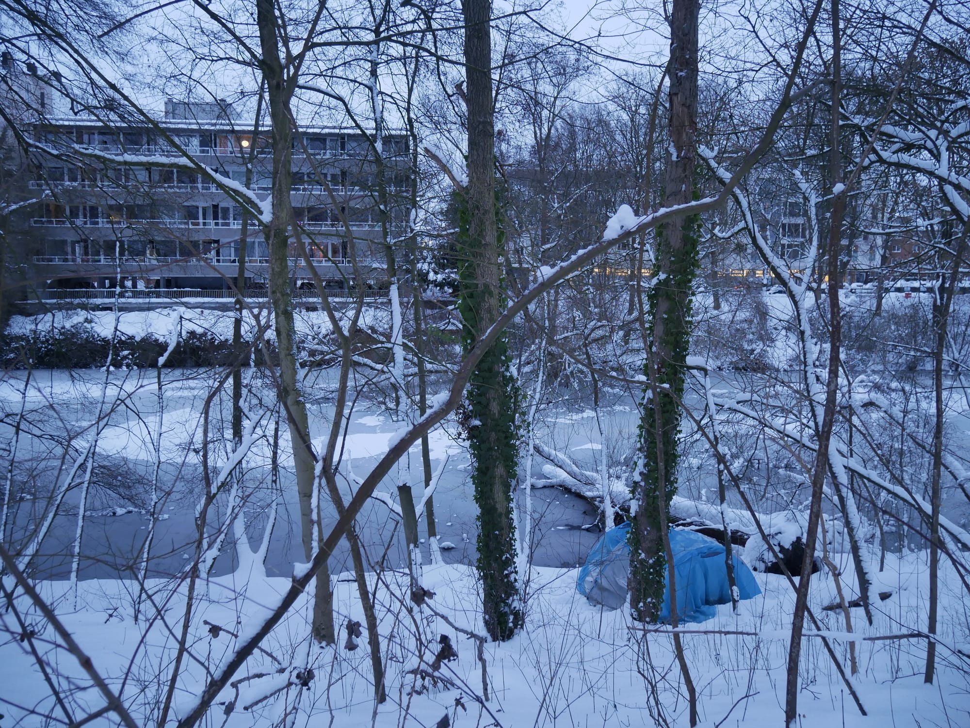 Er hockte mit gebeugtem Rücken in sich zusammengesunken da und stierte auf den Fluss, auf dem Eisschollen in großer Zahl trieben. Nur manchmal blickte er auf und schaute auf das andere Ufer, wo durch das verschneite Dickicht die Umrisse eines riesigen Gebäudes schimmerten. Ich hörte ihn laut seufzen.